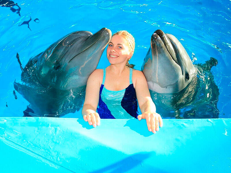 Вы спуститесь в воду, дельфины подставят Вам спинные плавнички и прокатят один круг по периметру бассейна и Вы получите незабываемое впечатление вместе с красивым фото формата А4 в подарок.